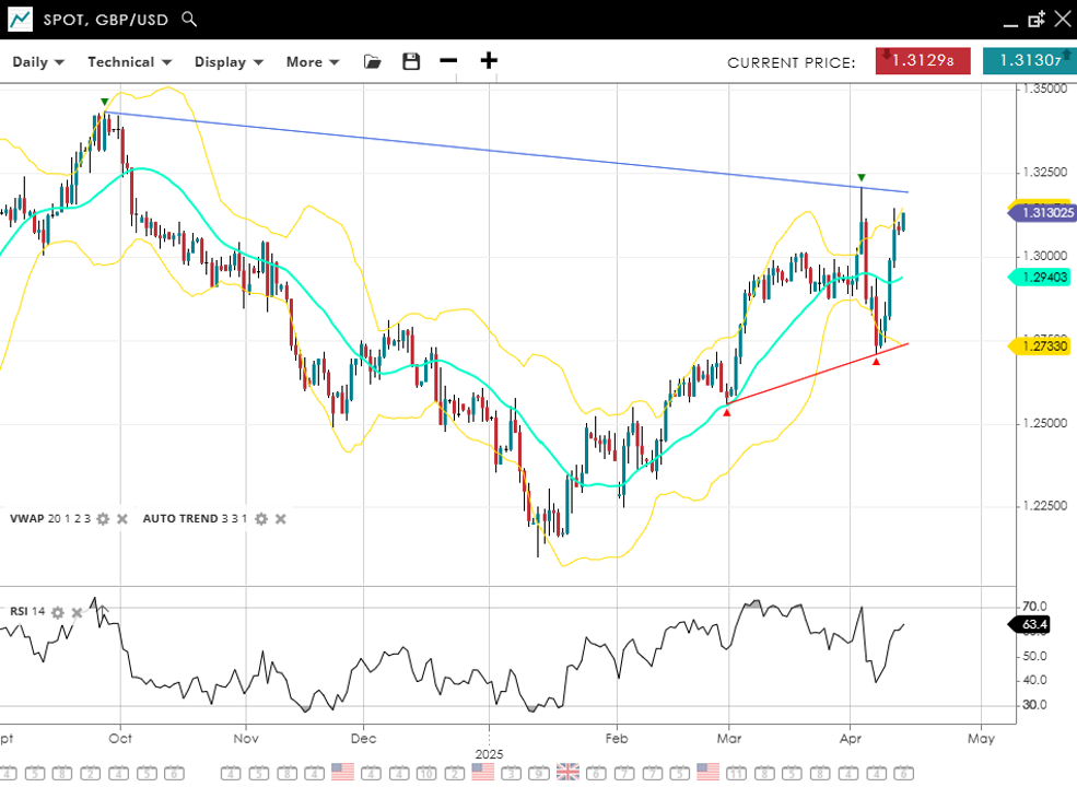 GBP/USD continues its impulsive bullish move, currently trading at 1.3130, just above the VWAP of 1.2940. RSI at 63 reflects solid bullish momentum. Support sits at 1.2733, while resistance coincides with the current high at 1.3130.