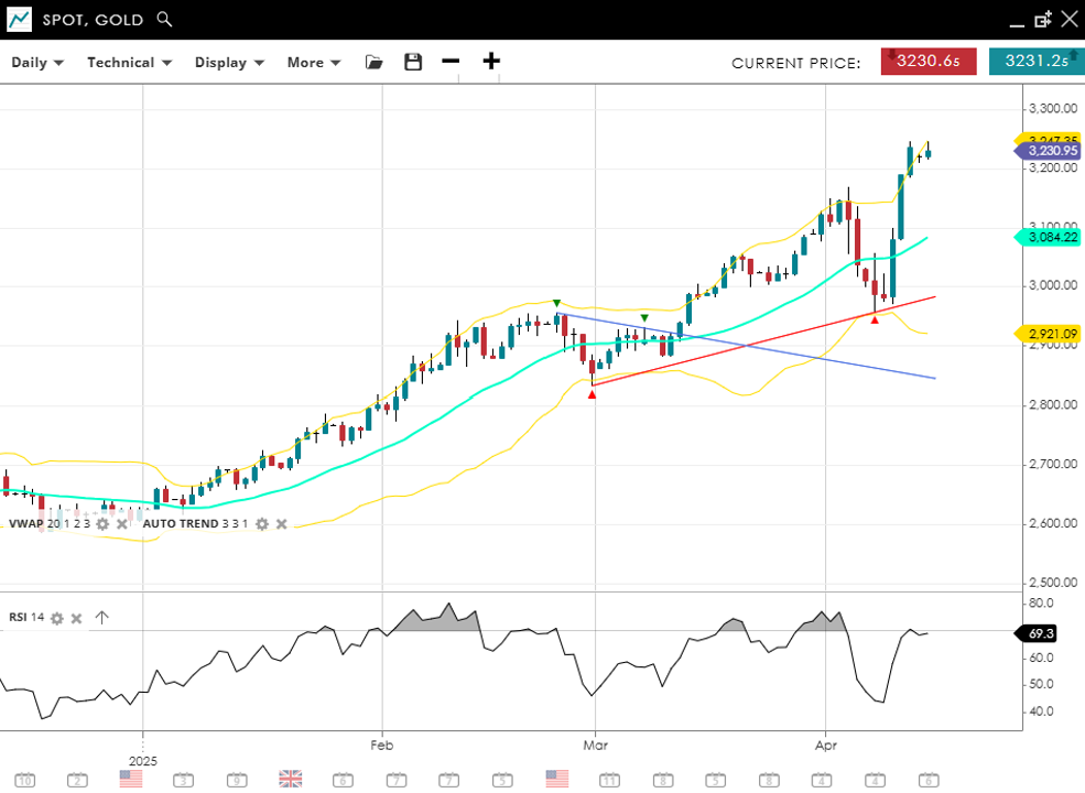 Gold continues to show strength, advancing in an impulsive bullish trend to yet more record highs. It trades at 3,231, above its VWAP of 3,084. The RSI at 69 places it just shy of overbought levels, suggesting momentum remains strong. Support rests at 2,921, while resistance is close at 3,231.