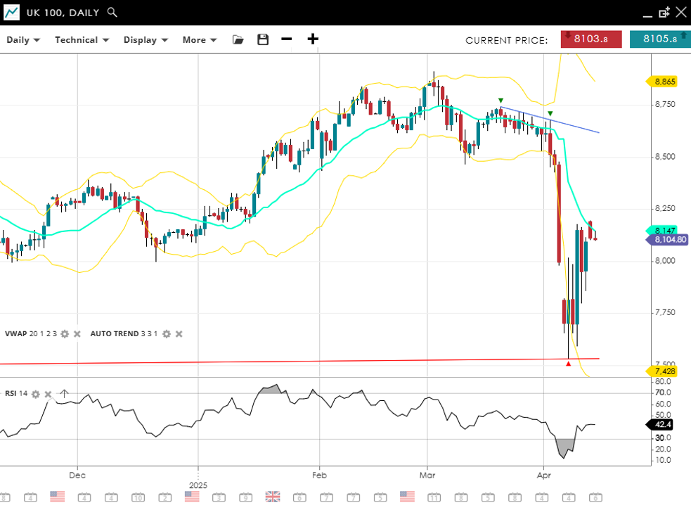 The UK 100 is in a bearish correction phase, hovering at 8,105 and just under the VWAP of 8,147. With an RSI of 42, momentum remains muted but no longer extremely weak. Support is seen at 7,428, and resistance looms at 8,865.