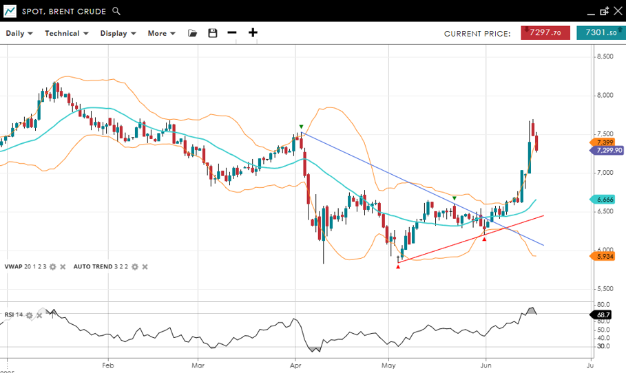 Brent Crude is in a bullish trend with a big impulsive phase underway. It's trading at 7,299, well above the VWAP of 6,666, suggesting very strong upward momentum. The RSI of 68.7 further supports this view. Support is at 5,934 and resistance is at 7,399.