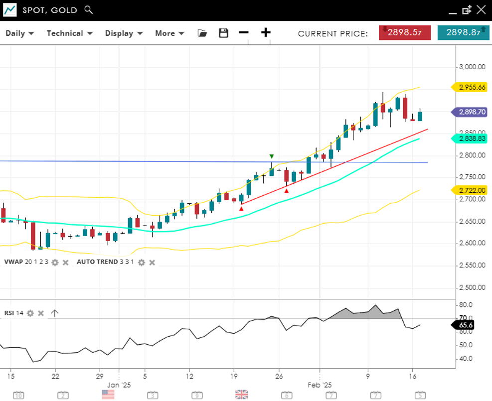 Germany 40 maintains its bullish momentum, currently trading at 21,740, well above its VWAP (20) of 21,399. The trend remains positive, with support at 20,825 and resistance at 21,974. An RSI reading of 66 signals sustained strength, though a third bearish RSI divergence is a sign a larger correction to the trend could be coming.