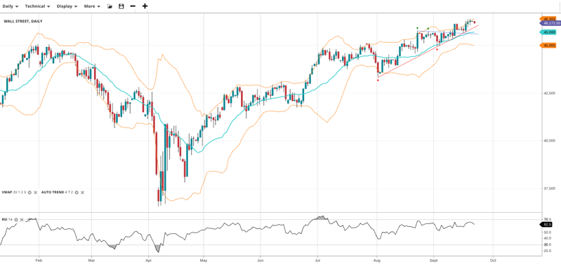 Wall Street continues in a bullish impulsive phase, trading at 46,173 - just under a record high set on Friday - and above its VWAP of 45,699. RSI at 63 supports strong upside interest. Support is at 45,005, resistance at 46,393.