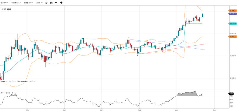 Gold is in another strong bullish impulsive phase, trading at 3,723, a fresh record high, and above VWAP of 3,613. RSI at 77 indicates strong overbought conditions. Support is way down at 3,467, resistance at 3,759.