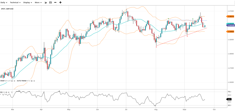 GBP/USD Having failed to take out the annual highs after its recent bullish surge, GBP has turned back into a neutral range, trading at 1.3502 just below its VWAP of 1.3525. RSI at 48 suggests mild downward pressure. Support at 1.3393, resistance at 1.3657.