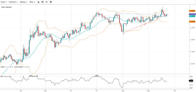 EUR/USD is undergoing a pullback after a ‘fakeout’ that saw it briefly hit new yearly highs, trading at 1.1777, just above VWAP of 1.1735. RSI at 55 supports continued buying interest. Support is 1.1624, resistance at 1.1846.