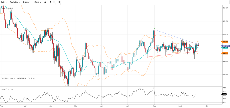 USD/JPY is neutral within a range, trading at 147.87 above its VWAP of 147.59 after a ‘fakedown’ below recent lows. RSI at 53 indicates a balanced market. Support is 146.51, resistance at 148.68.
