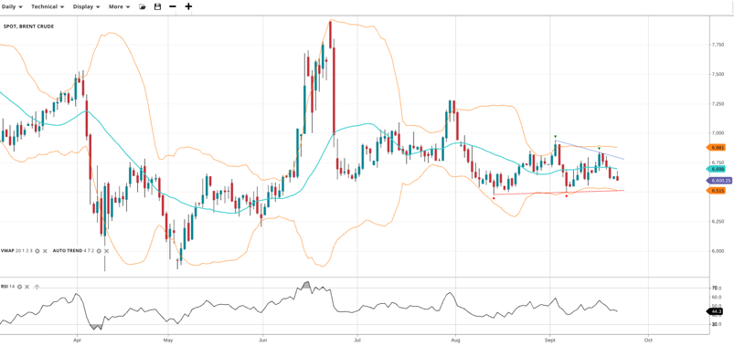 Brent Crude remains range-bound, trading at 6,600 near its VWAP of 6,698. RSI at 44 suggests balanced-to-weak bias. Support is 6,515, resistance at 6,881.