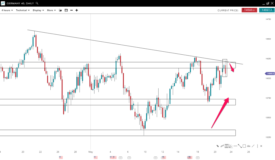 The price of GER40 is trying to break the resistance zone near the 14,160 mark. However, the index faced strong resistance from the trendline and the supply zone where a bearish engulfing candlestick pattern was posted. This could lead to a reversal and a move lower toward the 13,700 mark.