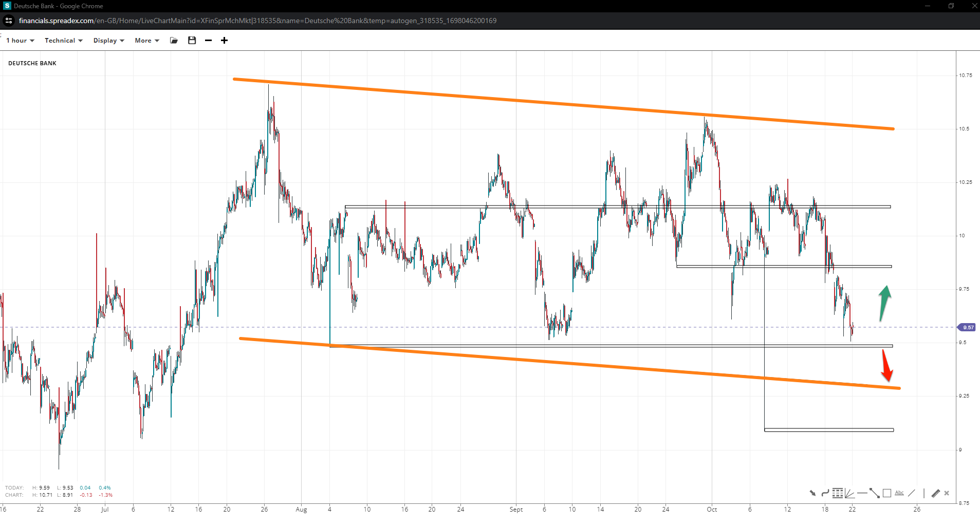 Deutsche could head down to €9 if the trend continues within the descending channel and under €9.85 unless the bottom trendline holds bears off. If the local resistance is won over, the low might be in, possibly triggering a move toward double digits again.