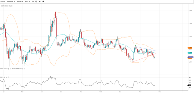 Brent Crude has broken down to its lowest levels since October but remains above the critical $60 level, with price at 6,191 below VWAP at 6,357. RSI at 40.3 reflects downside pressure. Support is 6,105 and resistance is 6,553.