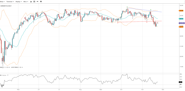Germany 40 looks bearish with a possible breakdown from its current trading range. Trading at 23,283 and below the VWAP of 23,710, RSI at 39.7 supports a more negative sentiment. Support lies at 22,917, while resistance is at 24,504.
