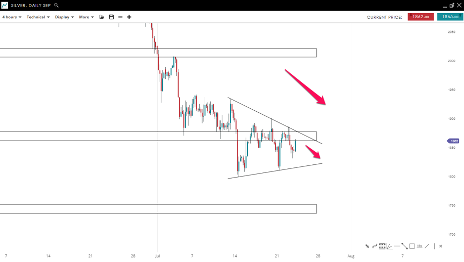 The price of Silver is bouncing inside a triangle formation right under the resistance level (18.70). Since the market is in a downtrend, we could see a breakout to the downside, where more sellers could push it all the way down toward the 1,740 mark. A breakout of the wedge formation to the upside could lead the price to reach the 2,015 mark.