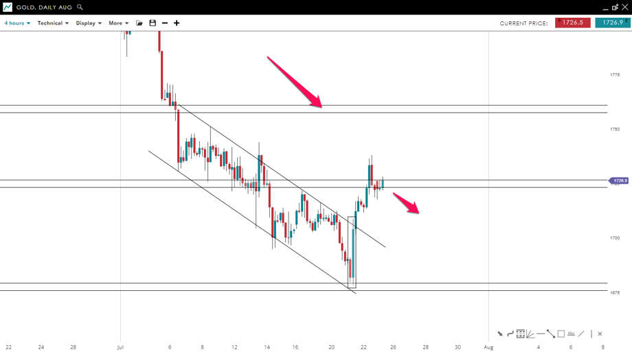 After posting an engulfing bullish pattern the price of Gold broke above the bearish channel and closed above the pivot level. However, the breakout looks weak since a big bearish bodied bar was posted at this zone, which could lead to a reversal and a move to the downside toward the 1,675 mark. However, if the price stays above the 1,725 mark we could see gold reaching the 1,760 mark.