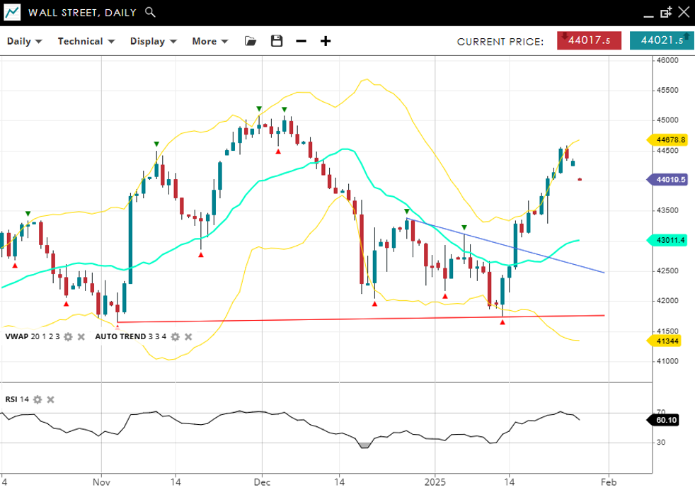 Wall Street continues its bullish impulsive trend, trading at 44,019, exceeding its VWAP (20) of 43,011. Support is located at 41,344, while resistance is seen at 44,678. The RSI at 60 reflects balanced momentum, supporting further potential gains.