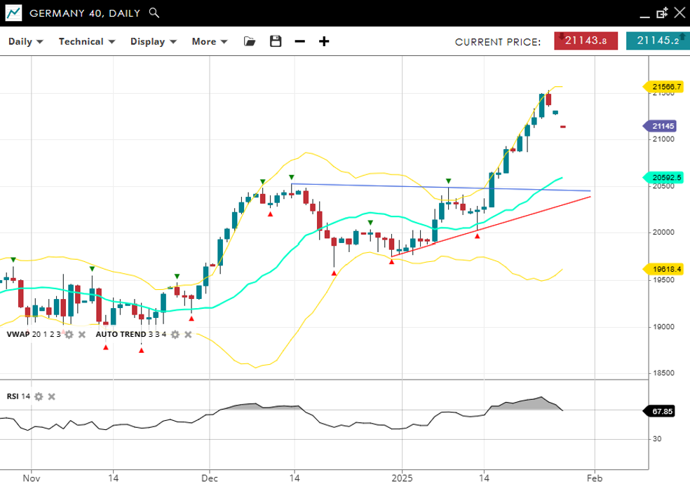 The Germany 40 remains in a robust bullish impulsive phase, trading at 21,145, still well above its VWAP (20) of 20,592 despite a pullback on Monday. Support is established at 19,618, while resistance is at 21,566. With the RSI at 67, the index shows strong upward momentum.
