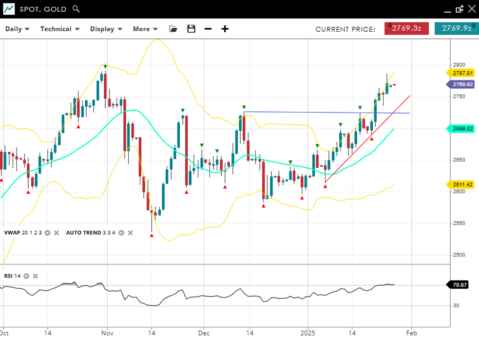 Gold has flipped into a new bullish impulsive trajectory, trading at 2,769, comfortably above its VWAP (20) of 2,699 but still below the record high. Support is seen at 2,611, with resistance at 2,787. The RSI at 70 signals that the market is at the edge of overbought territory.