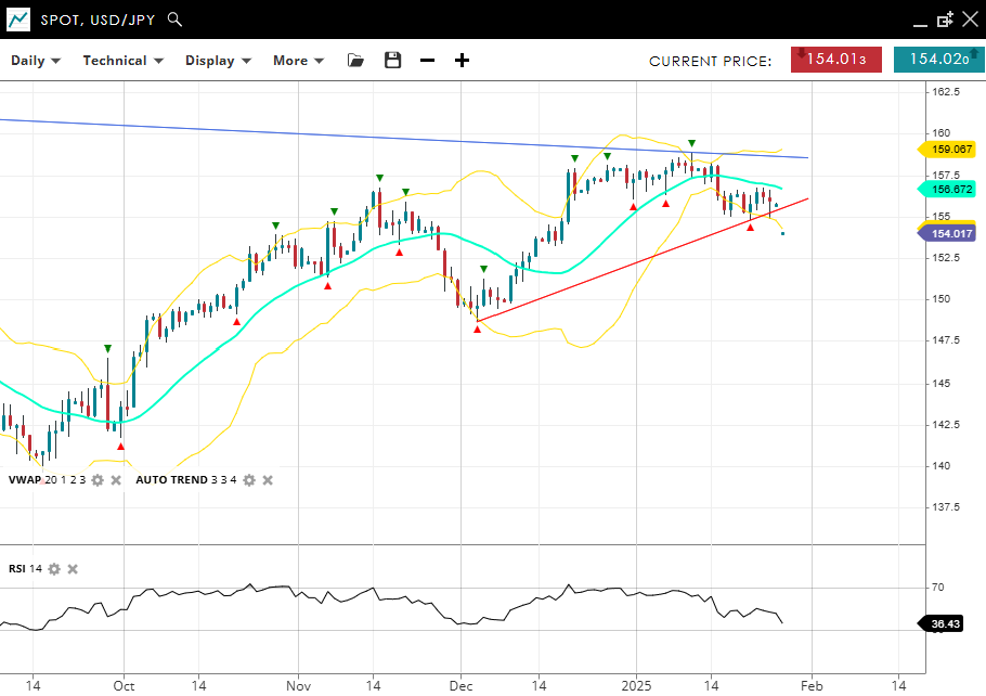 USD/JPY is deeper into a bullish correction phase, trading at 154.01, below its VWAP (20) of 156.67. Support is anchored at 154.20, and resistance is seen at 159.06. The RSI at 36 suggests fresh bearish momentum.