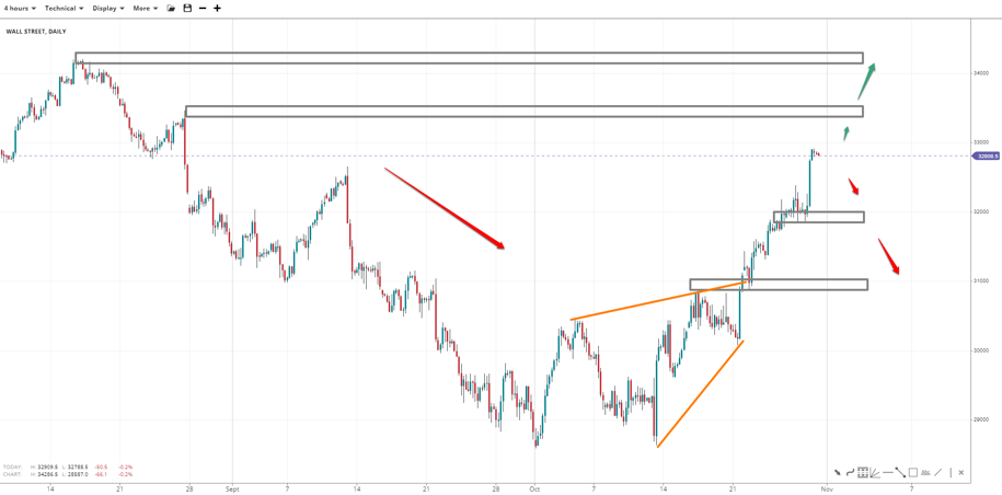 Wall Street rose close to the target of 33k with increasing momentum, hinting at a near-term resistance followed by a pullback. 32400 is apparent support above 32000 and 31000, but a reversal may be due if the latter fails to hold. Otherwise, an attempt at 34300 might ensue if bids break past 34400.