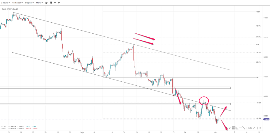 Wall Street retested the bearish side of the descending channel and slid lower, breaking past 29000. If the 28,900 the 61.8% Fibonacci retracement of the move from 34300-31000 28900 fails to hold, 29,650 is the next milestone for bulls. Falling below 28,580 exposes 28,500 and 28,000 as next support.