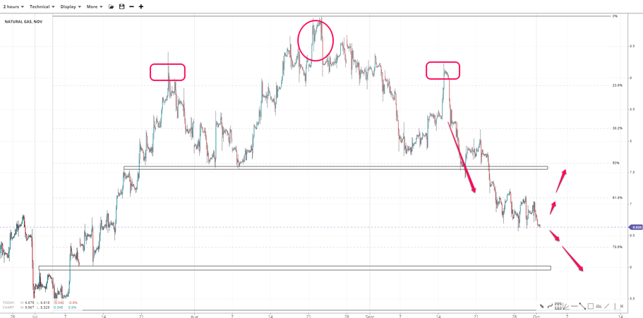 Natural gas prices did not get past the golden pocket at 7.10, with the inverse head-and-shoulders paving the way to 5.00. Above there lies the 78.6% Fibonacci of the 5.30-10.00 leg near 6.30, with 6.00 a round support in between. If the top is taken out, 7.50 makes a decent resistance.