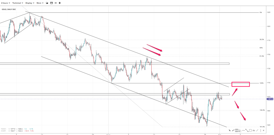 Gold prices stopped near the channel bottom at 1625 and reversed toward 1680. The bias remains bullish as long as prices hold above 1650, which is the 138.2% Fibonacci extension of the 1825-1700 leg. Breaking higher brings 1700 into the bull's radius. But the short-term top must give in.