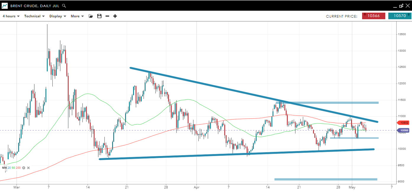 Price has made a higher high and higher low, putting an end to the drawdown from the April 21 high. A break above 7550 would suggest a re-test of the prior high at 7670, while a failure would imply the move up off the lows was corrective and that another test of 7300 is likely.