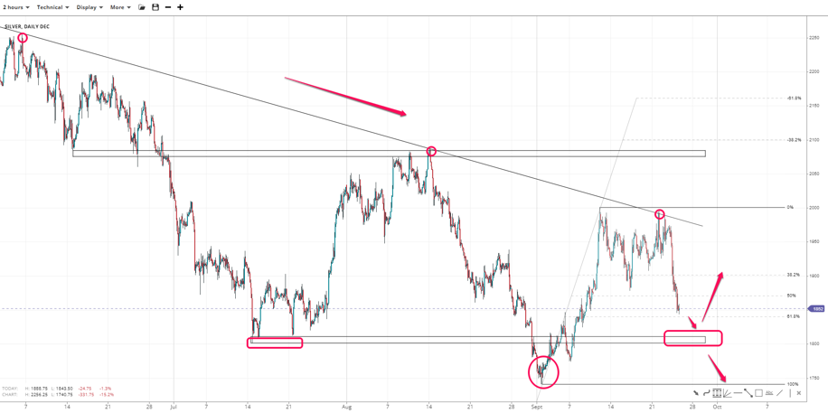 Gold broke outside the flag and below the 138.2% Fibonacci of 1825-1700 near 1650, paving the way to 1620 and the round 1600. The channel-bottom rejection might offer a rally towards 1680 if the swing of 1660 gives in. Otherwise, a range could form.