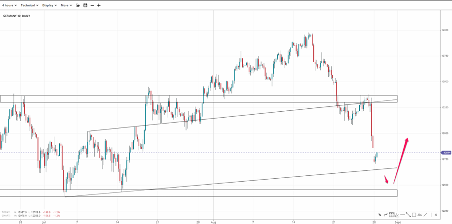 Germany 40  lost the support at 13,000 after bulls received rejection at the channel top near 13,300. The former is now major resistance and the 12,600 channel bottom offers key support. Breaching the channel downwardly might offer a near-term bounce following a double-bottom at 12,400.