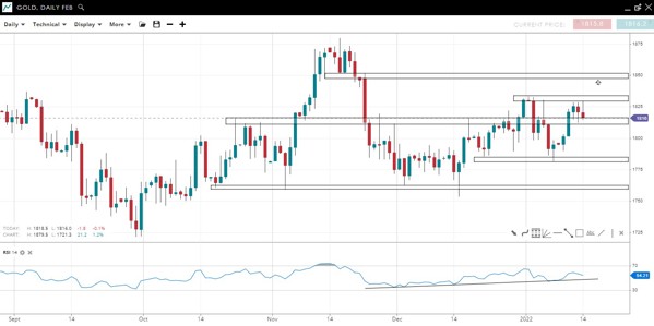 The price has stalled at 1830 for a second time in January. Two hanging men and a shooting star pattern on the daily candle chart imply a further decline but the rising RSI trendline supports higher prices.