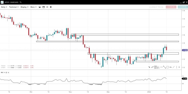 The false breakout to new highs on Jan 4 has led to a choppy pullback to the former record high from August 2021. Three long tails on daily candlesticks in the past week suggest strong demand.