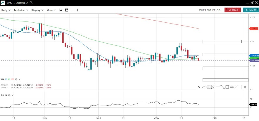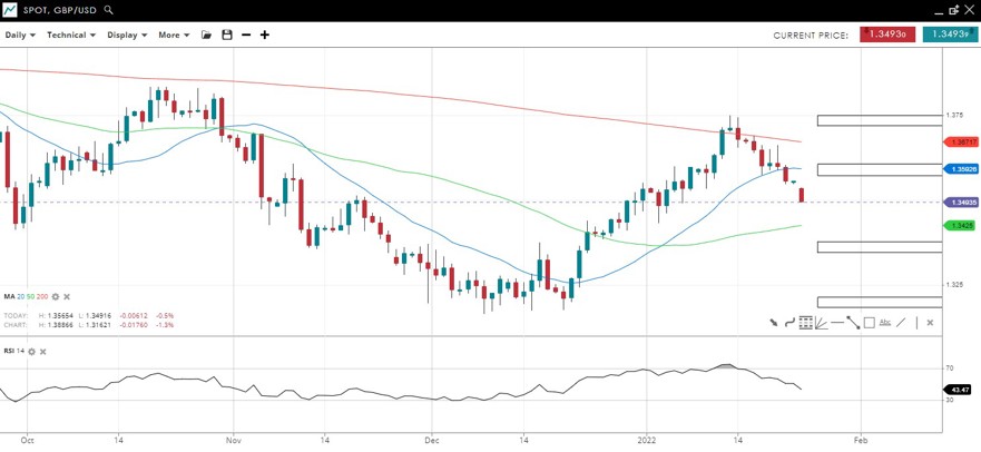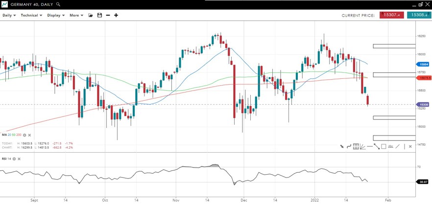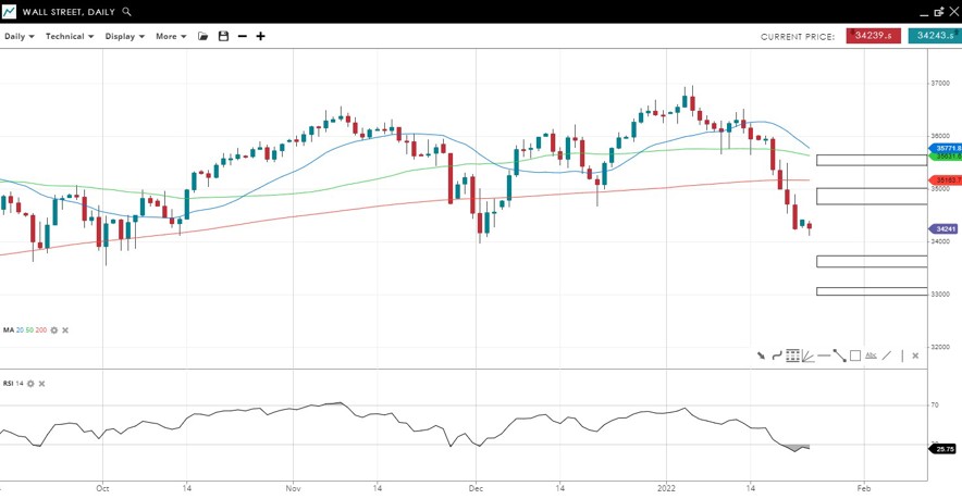 The price made new lower lows of the daily candlestick chart with 4 straight large daily declines. RSI is now oversold ahead of the December low at 34,000.