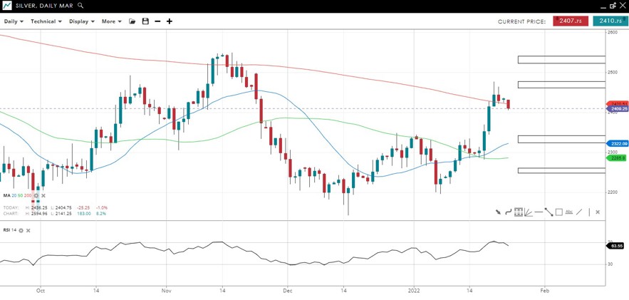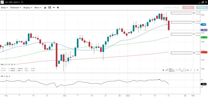 The UK 100 has dropped back from 7600 and is now testing 7400 under the 20 DMA. The trend is still up while above 7360, the Dec 31 low and 50 DMA.