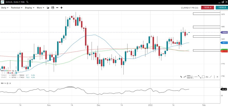 The price broke above 1830 resistance and has pulled back to test the area as support. Some upwards momentum is building for a possible test of the 1880 peak.