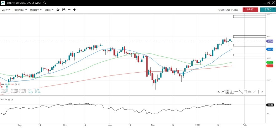 The price has dipped slightly ahead of the big 90 figure but has already rebounded off the prior peak near 86.