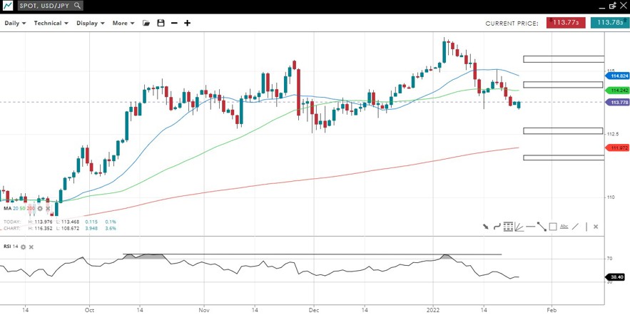 The hammer pattern last week was matched by a bearish shooting star off the 50 DMA and the price is back testing support at 113.50.