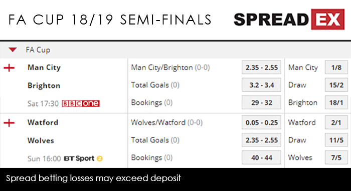 Lurking 5 points above the drop-zone in the league, Brighton’s journey has been similarly lacking top tier opposition. They have, however, found things a bit more difficult than City. A 3-1 win at Bournemouth was a confident start; an extra-time victory over West Brom in their 4th round replay less so. Derby were then handily dealt with in the 5th round, Brighton winning 2-1, only for the Seagulls to require penalties to get past Millwall in the quarter-finals, the club requiring 2 very late goals from Jurgen Locadia and Solomon March to even get to that point. Sergio Aguero – if he plays – sits at a huge Super Mega PGM of 81-96, with Gabriel Jesus at 76-88 and Raheem Sterling at 50-58; Brighton, meanwhile, are reliant on Glenn Murray at a paltry 9-13. Have a guess who’s favourite? Spreadex are offering a rather conclusive Man City/Brighton Goal Supremacy spread of 2.35-2.55, alongside a Total Goals spread of 3.2-3.4. Sunday then sees 2 of the season’s more surprisingly propositions face-off, as Watford hosts Wolves at 6pm on BT Sport 2. Wolves arguably have more top tier scalps than anyone else in 2018/19; in the FA Cup they knocked out Liverpool in the 3rd round and Man United in the quarters, while in the league they’ve beaten Chelsea, Tottenham and United (again). Compare that to the fortunes of fellow Championship promotees Cardiff and Fulham and it shows just how well the club have done since making their Premier League return. Slightly less challenging than Wolves’ run, Watford have nevertheless been incredibly efficient in the FA Cup so far. Their first 3 fixtures were on the road, with the Hornets storming through Woking, Newcastle and QPR without conceding a single goal. The quarter-finals then saw them beat Crystal Palace 2-1 courtesy of a 79th minute winner from Andre Gray (who heads into the semis at a Super Mega PGM of 19-23, behind Troy Deeney’s 20-24 and Raul Jimenez’s 27-32). Though a single point may separate them in the league, the Midlands half of this tie are the ones who have proven their big game credentials, with Spreadex offering a Wolves/Watford Goal Supremacy spread of 0.05-0.25 alongside a Total Goals spread of 2.35-2.55.