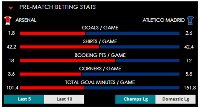 To see all the Arsenal v Atletico Madrid betting stats and form, visit our pricing page to view our Pre-Match betting stats table or hover over/tap the chart image to see previous outcomes for that particular market.