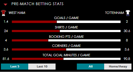 To see all the West Ham v Tottenham betting stats and form, visit our pricing page to view our Pre-Match betting stats table or hover over/tap the chart image to see previous outcomes for that particular market.